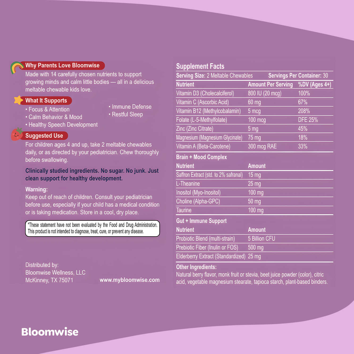 Bloomwise isn’t just another kids' supplement — it was created by real moms who understand real struggles. Formulated with the guidance of medical experts like Dr. Emily Cooper, every meltable is designed to support calm, focus, and emotional balance — with ingredients moms trust and science supports.